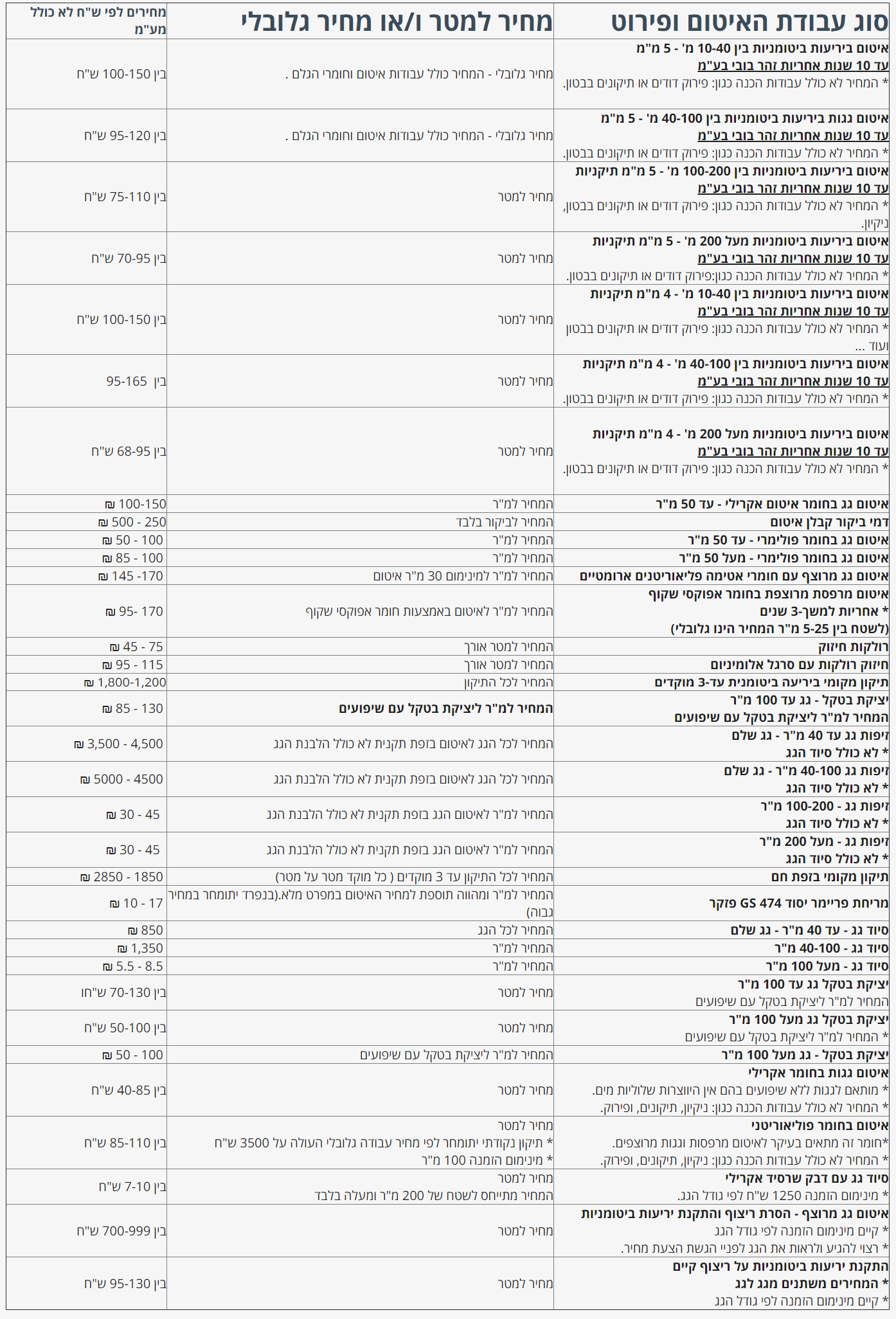 - ישנם סעיפים במחיריון שכוללים מינימום הזמנה / מחיר עבודה גלובלי אשר נקבע במקום ולפי סוג העבודה וחומרי הגלם המתאימים לעבודות האיטום הנדרשות.